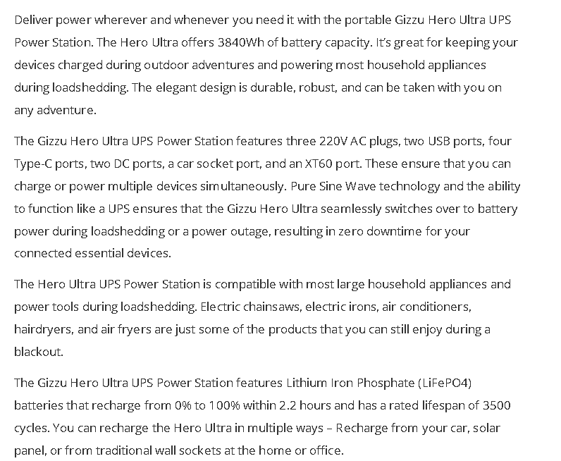 Deliver power wherever and whenever you need it with the portable Gizzu Hero Ultra UPS Power Station. The Hero Ultra offers 3840Wh of battery capacity. It’s great for keeping your devices charged during outdoor adventures and powering most household appliances during loadshedding. The elegant design is durable, robust, and can be taken with you on any adventure.